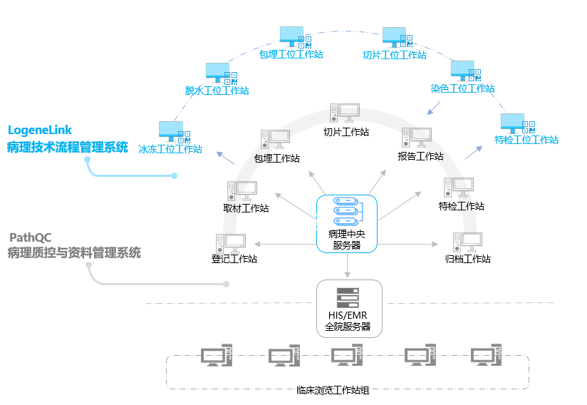 面向有精細化管理需求的大型醫院病理科,朗珈提供PathQC病理質控與資料管理系統與LogeneLink病理技術流程管理系統無縫整合的整體解決方案,實現了從標本接收、病例登記、取材、冰凍、脫水、包埋、切片、染色、樣本交接、免疫組化、特殊染色、組織學報告、細胞學報告、分子病理報告、入庫歸檔、借還片管理、標本銷毀等技術制片和診斷相關環節進行病理全流程綜合管理。